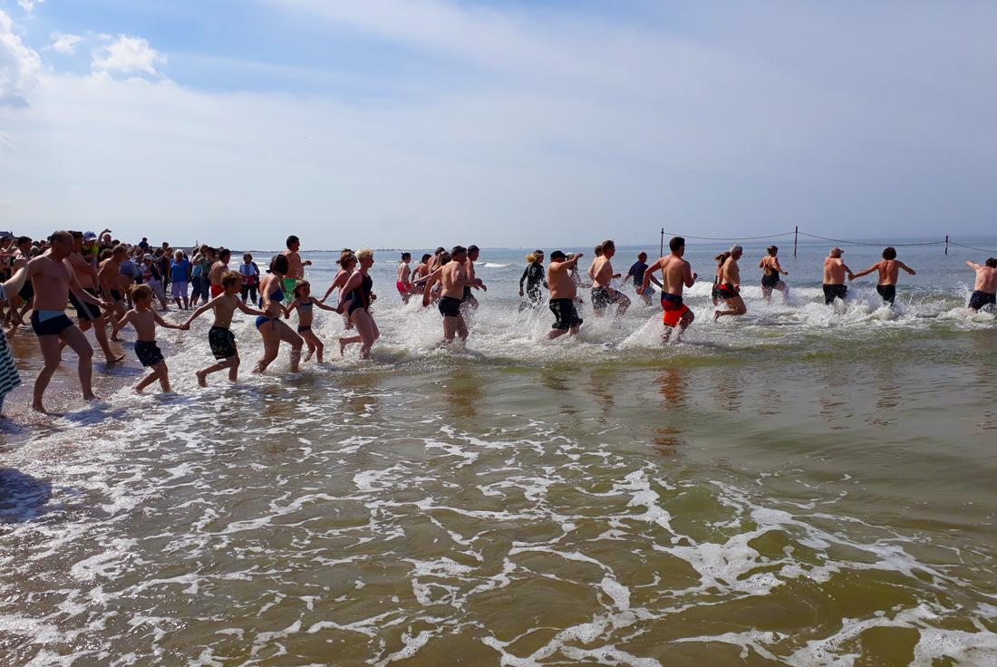 Traditionelles Anbaden auf Baltrum ist jedes Jahr am 15. Mai – je nach Tide morgens, mittags oder auch mal nachmittags. Für Ihre Sicherheit am Badestand sorgen die ehrenamtlichen Rettungsschwimmer der Deutschen Lebensrettungsgesellschaft DLRG, die von Mai bis Oktober ihren Posten im Badeturm beziehen.