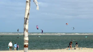 Die Sandbänke vor dem Strand sind es, die das Gebiet – der Kiter sagt „den Spot“ – so reizvoll machen; Wind und Wellen und die Gezeiten tun ihr Übriges.